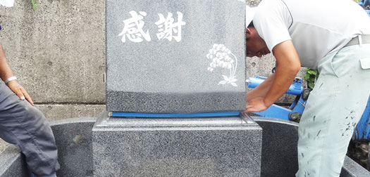 基礎工事からお墓完成まで工程管理を徹底、見えないところにもこだわります。また、当社独自の耐震施工工法など、天災にも強いお墓づくりにも心がけております。