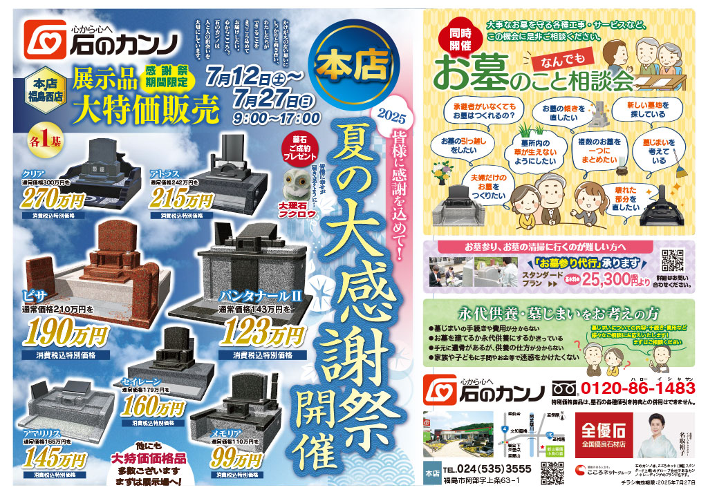 石のカンノの店舗では、墓地・お墓に関する相談、展示商品の見学、見積相談など事前のご予約で優先的にご案内させていただいております。まずは下記の担当店舗までお気軽にご予約・ご来店ください。お電話でのお問合わせも承っております。