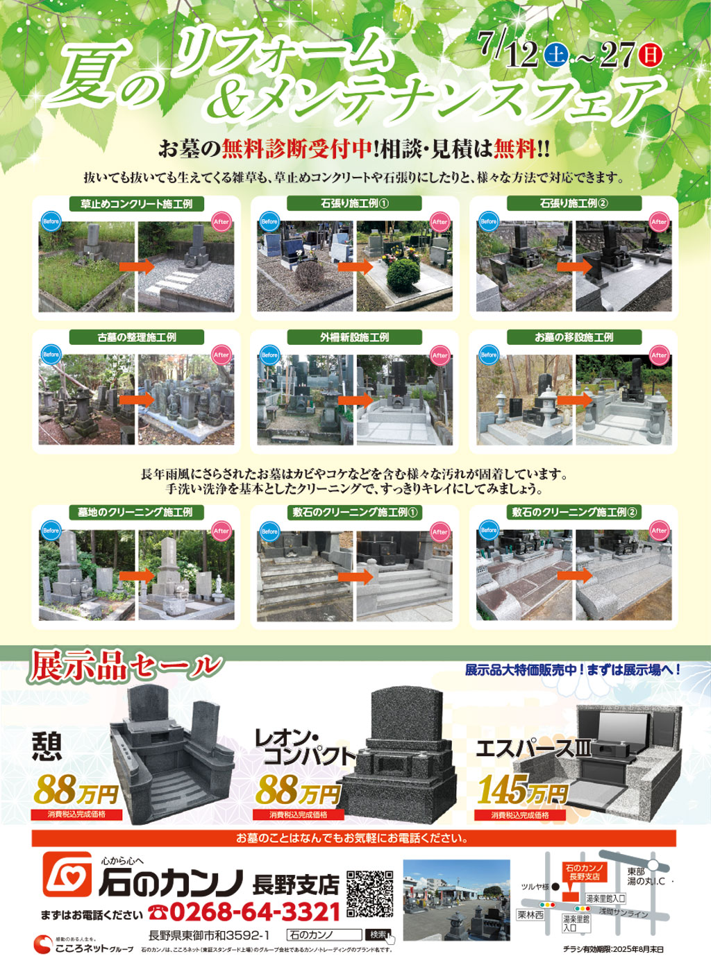石のカンノの店舗では、墓地・お墓に関する相談、展示商品の見学、見積相談など事前のご予約で優先的にご案内させていただいております。まずは下記の担当店舗までお気軽にご予約・ご来店ください。お電話でのお問合わせも承っております。