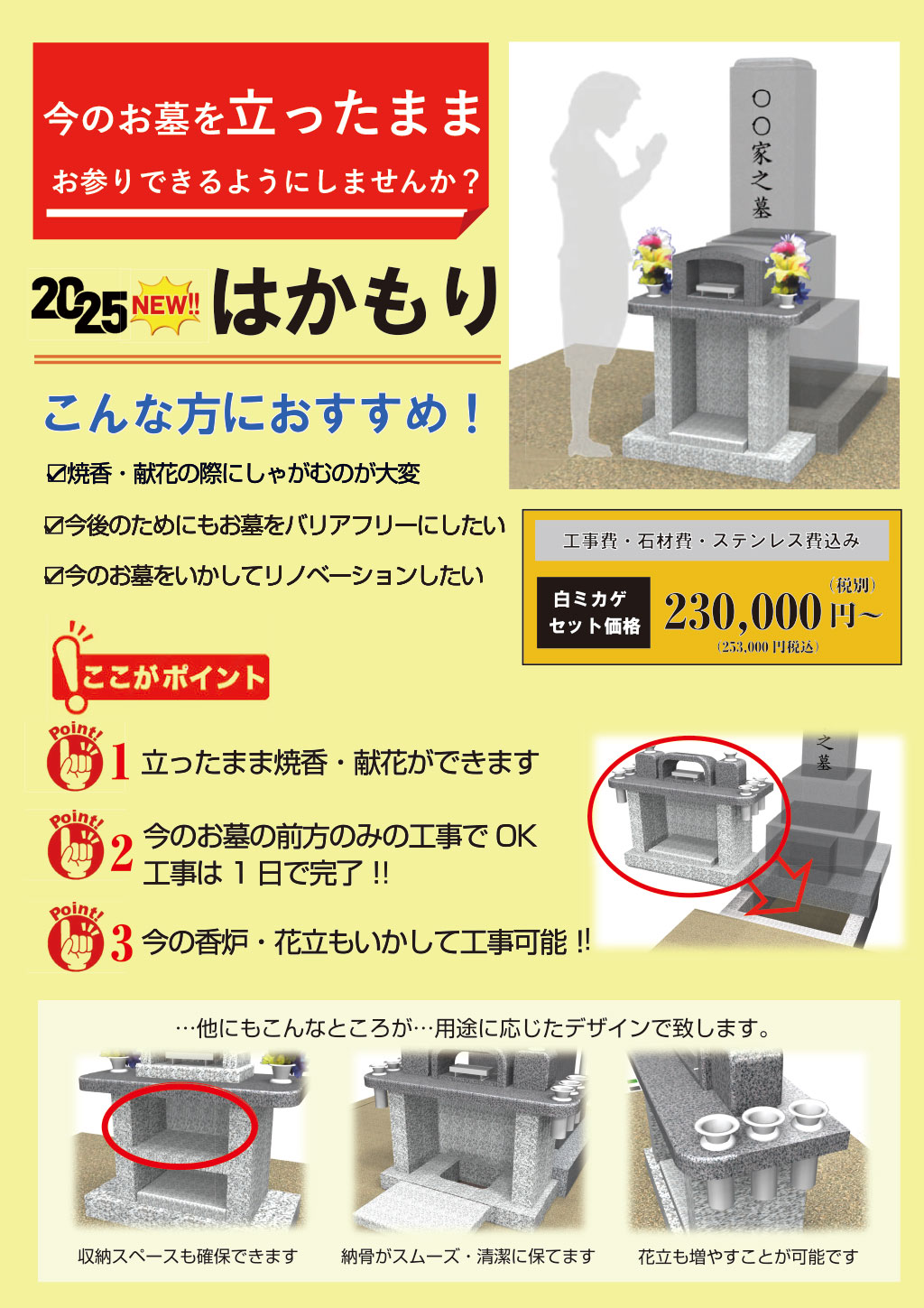 『はかもり』は今のお墓の前方のみを工事するだけで、立ったまま焼香・献花ができるサービスです。工事は1日だけ、今の香炉・花立も活かせるので気軽に導入することが可能です。今のお墓を『はかもり』で立ったままお参りできるようにしませんか?