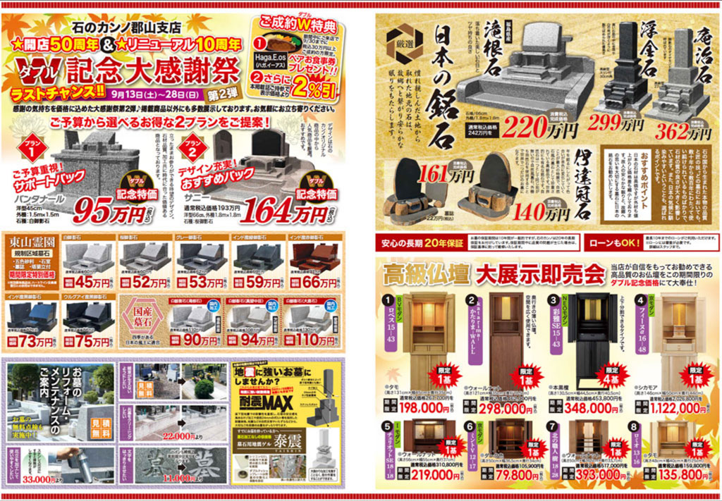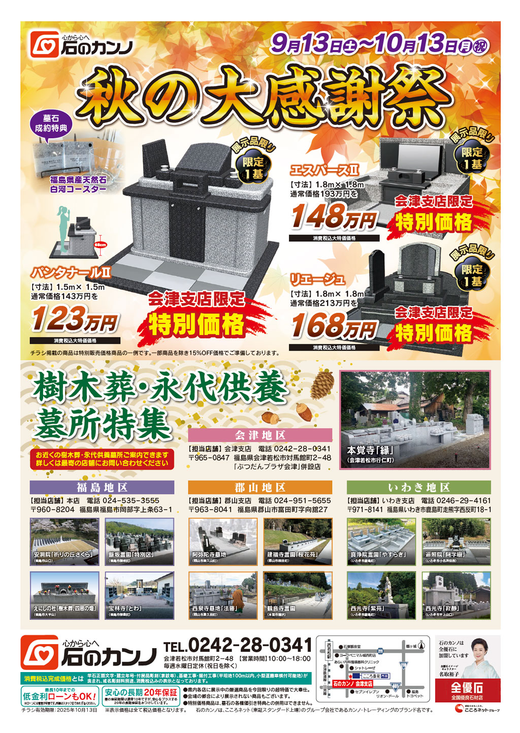 9/13(土)~9/28(日)まで開催の秋の大感謝キャンペーンチラシです。下記よりご希望の店舗をお選びください。