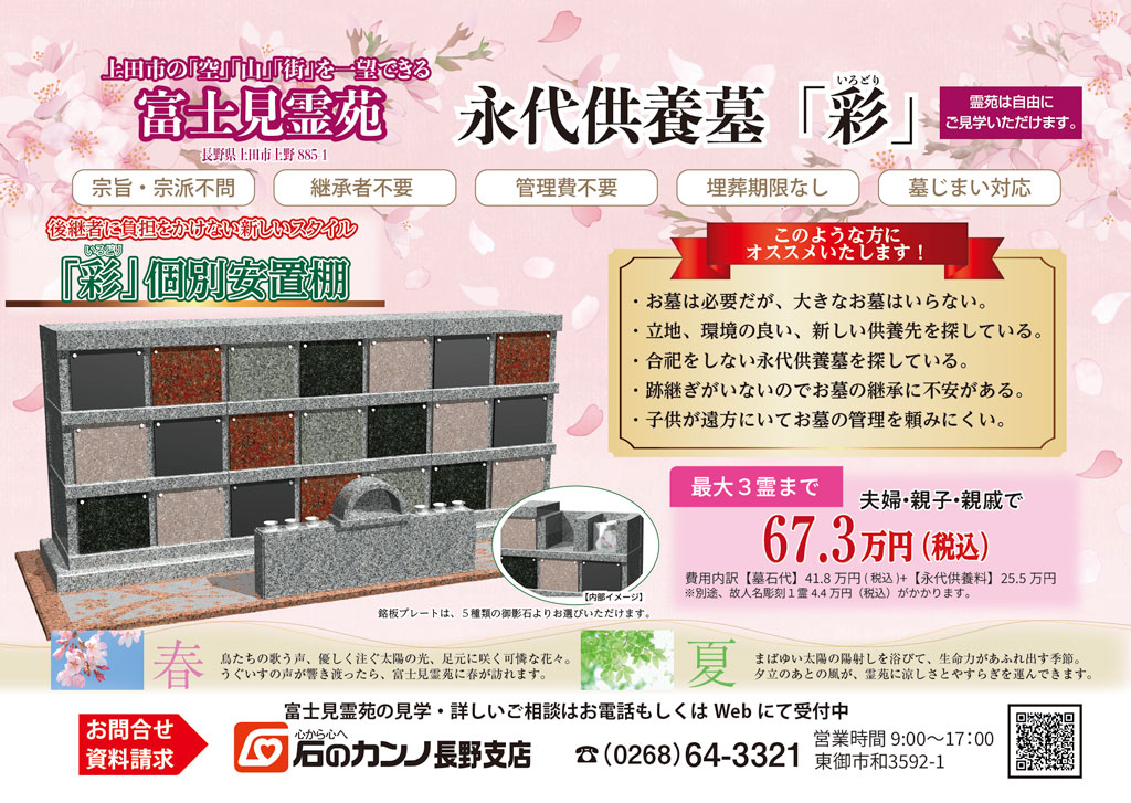永代供養(えいだいくよう)とは、お墓の継承者がいない場合や費用などに問題がある場合に、霊園や寺院などが遺骨を管理・供養する供養方法です。石のカンノより永代供養墓のあるおすすめの霊園・寺院ご紹介いたします。詳細につきましては、担当店舗までお問い合わせ下さい。