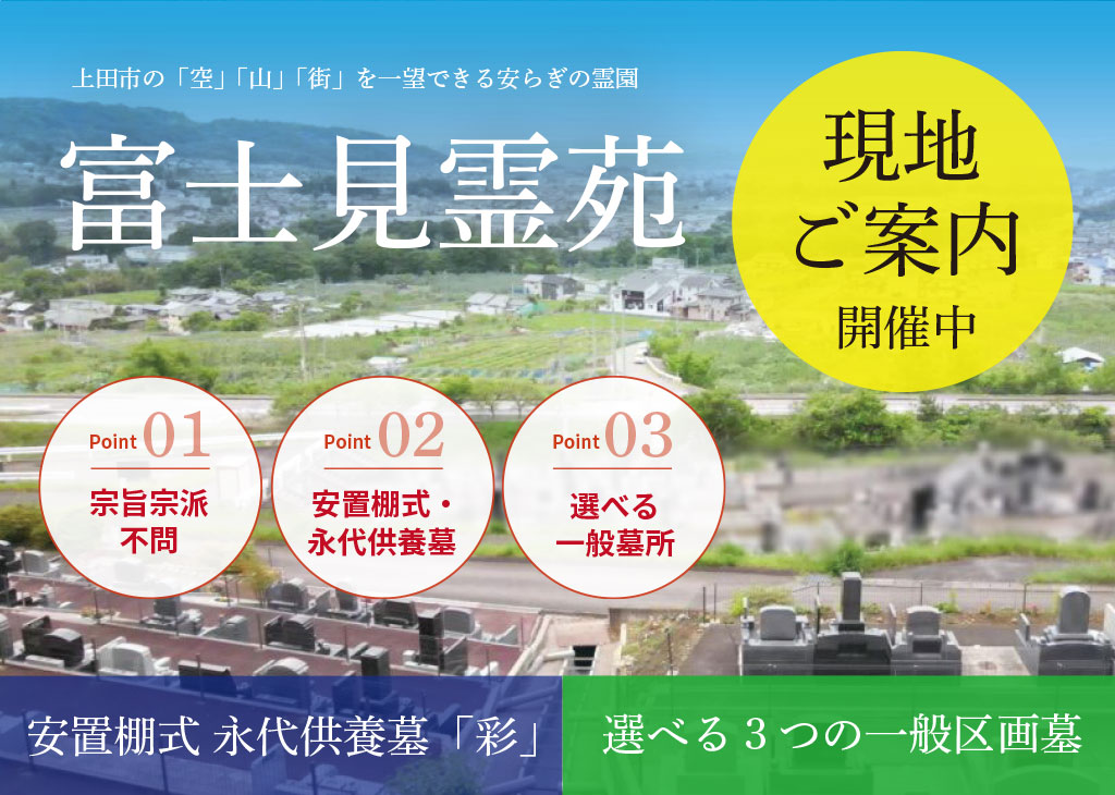 長野県上田市に所在する「富士見霊苑」は、一般墓所の他にも永代供養墓もあり、様々なニーズにお応えいたします。上信越道「上田菅平インター」から車で5分、上田市街を一望できる好立地・好環境の見晴らしの良い霊苑です。