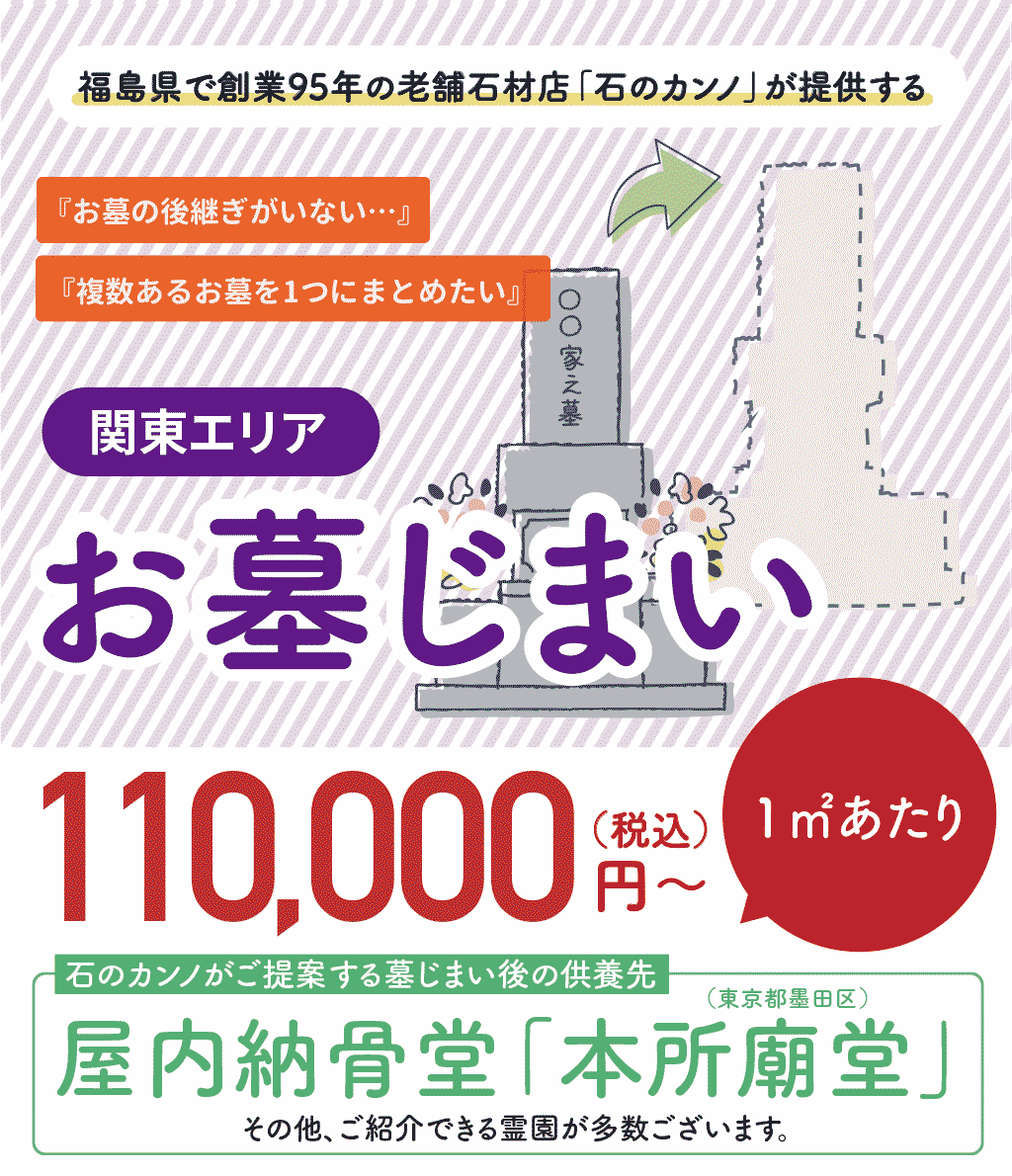 1㎡あたり110,000円~(税込)です。「墓石の処分にかかる費用+区画を更地にする費用」の費用以外にもお骨の取り出しを石材店に依頼する際は、別途作業料が発生いたします。