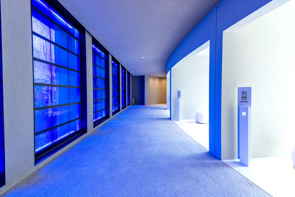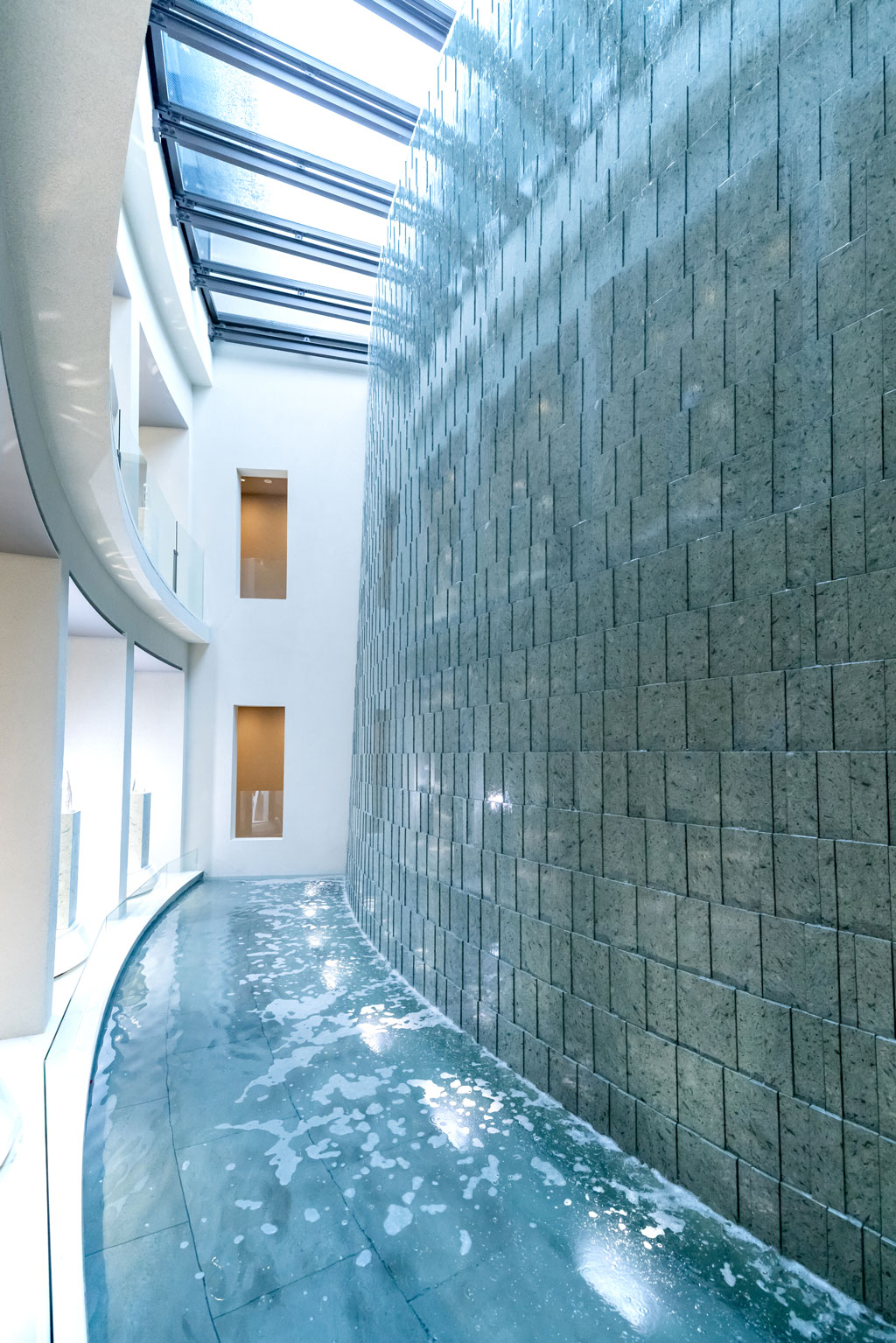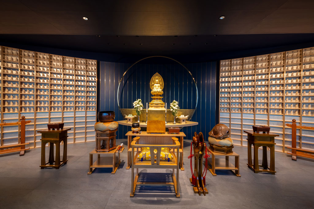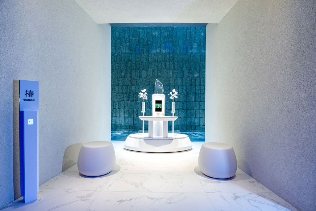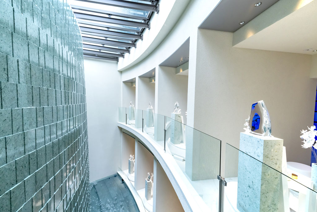 参拝室では、クリスタルガラスと流れる水の煌めきの先に、故⼈様のご遺骨が安置されています。屋内のため、天候を気にせず手ぶらでお参りできるのも魅力です。