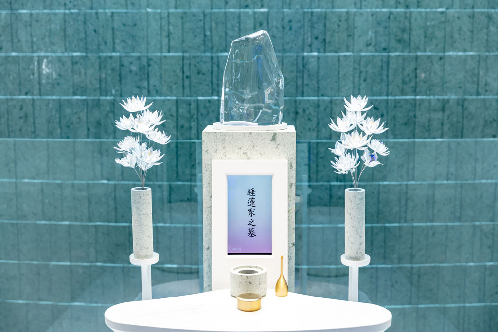 クリスタルガラスの墓石とクリスタルフラワーが参 拝者を迎えます。