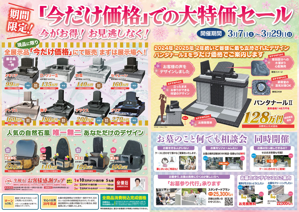 「お墓参りができて、こころのつかえがとれたような気がする。」「亡くなった人と会話ができる場所ができてほっとした。」などのお言葉を頂くと私たちの仕事の重みを強く感じます。そのようなお言葉を数多く頂けるようにスタッフ一同熱意をもって皆様のご要望にお応えしますので、お墓の事ならどんな事でもお気軽にお問合せ下さい。皆様のご来店をこころよりお待ちしております。