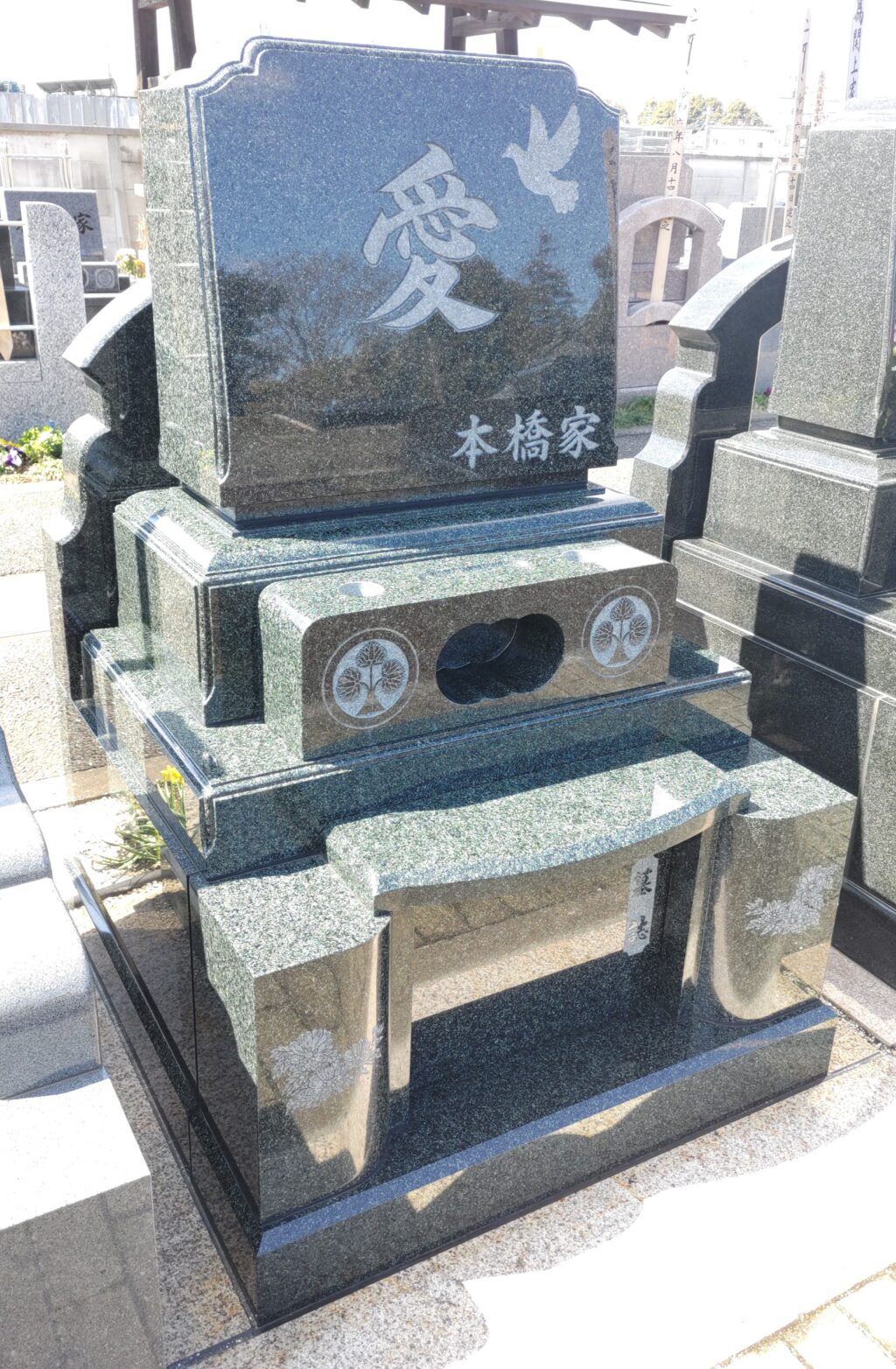 深緑色の石材に、重厚な家紋と優しい蓮の花のデザインは